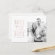 Um cartão postal de salvar a data simples e moderno com sotaques clássicos em preto, branco e falso ouro rosado faz sua foto de noivado se destacar e envia aos convidados as informações necessárias para planejar sua celebração de casamento com um monograma chic de casal dentro de anéis de casamento entrelaçados. O texto fácil de personalizar torna este cartão postal uma escolha inteligente!