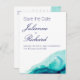Um cartão postal de "save the date" em aquarela moderno e elegante, apresenta um mar turquesa abstrato, todos os detalhes são grafados em uma mistura de tipografia moderna e caligráfica.