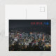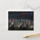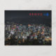 Cartão postal de Seul, Coreia do Sul à noite com uma silhueta da capital sul-coreana com luzes noturnas e um letreiro de Seul em letras latinas ocidentais e tipografia coreana tradicional.