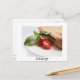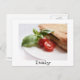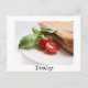 Cartão postal com uma comida italiana saudável, constituída por um sanduíche de panini e um tomate, folhas de manjericão verde e queijo mozzarella, em fundo branco, com o seguinte texto: "Itália".