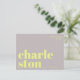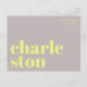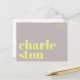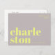Envie uma saudação elegante e contemporânea de Charleston, Carolina do Sul, com este cartão postal tipográfico moderno. Com a palavra Charleston dividida em duas linhas em letras minúsculas decorativas e em negrito em amarelo brilhante sobre um fundo cinza suave, este design é minimalista e atraente. A frase "saudações de" aparece acima em uma fonte sans serif fina e elegante, adicionando um toque moderno e sofisticado. Perfeito como uma lembrança de viagem, uma peça decorativa ou uma maneira única de enviar amor da sua cidade favorita. Ideal para fãs de design contemporâneo, tipografia e desejo de viajar.