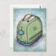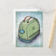 Torradeira em verde e azul com 2 fatias de pão branco espiando fora dos furos. Este pequeno eletrodoméstico de cozinha assenta num fundo listrado azul e verde desgastado.