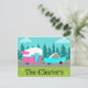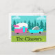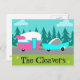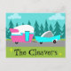 Este cartão postal de acampamento / reboque e carro retrô personalizável apresenta um desenho de desenho animado minimalista de meados do século que o deixará pronto para pegar a estrada aberta. Uma homenagem aos anos 50, este design apresenta um carro turquesa vintage com topo branco, puxando um reboque de viagem kitsch para seu destino final. O RV retrô perfeitamente restaurado tem uma metade inferior rosa-choque, metade superior branca e um raio turquesa separando os dois. A porta na lateral do trailer também é turquesa. O último destaque é a asa rosa-choque que se projeta da parte traseira desta casa sobre rodas. Os felizes campistas estão dirigindo por uma estrada cinza. A rodovia é cercada por grama verde exuberante. Ao fundo, podemos ver as silhuetas de um verdadeiro bosque de cedros, contra um céu aqua com nuvens azul-claro fofas. A parte inferior deste design pode ser personalizada! Este design é perfeito para todos, desde hippies aposentados, hipsters iniciantes ou qualquer pessoa que queira reviver algumas ótimas memórias da infância. A melhor parte é que ninguém está pergunt