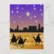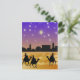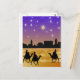 Os três sábios se aproximando de Belém com a estrela pairando no céu.