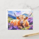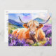 Um cartão postal encantador, com cor d'água, que inclui uma vaca escocesa Highland que descansa em urze. Excelente para enviar anotações, presentes ou enquadramento como decoração de casas rústicas.