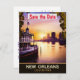 Convite de casamento de Nova Orleans, salve a data, cartão postal de viagem. O barco turístico está se aproximando da cidade pelo rio Mississippi.