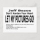 Simples leitura de texto, "Jeff Bezos." "Não Harden Your Heart", "Deixe minhas fotos irem!" O texto adicional diz: "A Amazônia permite que arte roubada seja vendida no mercado amazônico. Escreva a Jeff Bezos em jeff@amazon.com Diga-lhe que isto está errado." Amazon.com oferece a oportunidade de as empresas venderem produtos em seu mercado. De acordo com a "Important Information for International Sellers", um vendedor tem de concordar que a venda e a entrega do produto não violarão os direitos de propriedade intelectual de outros (por exemplo, o fabricante do produto). Isto não impediu muitas empresas estrangeiras de roubar trabalho de arte e designs para empresas Impressão a pedido como a Zazzle. Muitos milhares de imagens para travesseiros, porteiros e capas de telefone foram copiadas do Zazzle. Essas imagens roubadas são enviadas para a Amazônia para produzir produtos para venda a uma fração do seu preço normal de venda. Isso é feito sem a permissão ou licença do artista ou Zazzle. As imagens roubadas são de baixa resolução. Como resultado, as imagens impressas em produtos para venda no mercado amazônico são felpudos, turvas, distorcidas - o cliente recebe um produto inferior. É uma situação perder para artistas e clientes. Por favor, escreva para Jeff Bezos em jeff@amazon.com e diga-lhe que isto está errado. Todos os royalties recebidos da venda deste produto serão doados para caridade.