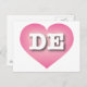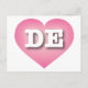 Este cartão tem um coração legal e calmo cor-de-rosa com um centro lavado em branco contendo as letras maiúsculas brancas em negrito DE, a abreviação oficial do estado de Delaware, o primeiro estado. O verso do cartão postal é vazio aguardando seus sentimentos manuscritos ou texto personalizado.