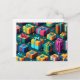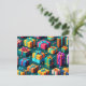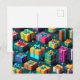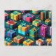 Um padrão vibrante e festivo com uma variedade de caixas de presente coloridas amarradas com fitas coloridas. As caixas são dispostas de forma lúdica e caótica, criando uma composição visualmente estimulante. O fundo é uma cor verde-escura, que contrasta lindamente com as cores brilhantes dos presentes. O efeito geral é alegre e comemorativo.