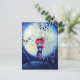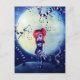 "Mal-iluminada" Uma gótica, parecida com uma boneca, com pigmeus vermelhos ferozes, fica em um topo surreal debaixo de uma lua de cheio brilhante. Vestida em uma roupa escura enfeitiçada com crânios e segurando um coelho estirado, ela está cercada por tentáculos riscados brancos, negros e brancos que torcem através de um céu noturno esboçado por estrelas.