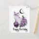 Cartão de aniversário com votos góticos. Gato estilo goth com lua crescente, caveira e rosas em uma paleta de cores preto e roxo que sua garota goth vai adorar. Personalize o campo de texto interno para um cartão de aniversário verdadeiramente mágico.