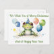 Um sapo bonito com um balão vermelho, azul e vermelho, sentado diante de você, com um chapéu de festas bonitinho, aquarela. O texto pode ser alterado se você usar a Ferramenta/Edição do Designer. Agora lê-se "Desejamos-Lhe Um Feliz Natal E Um Ano Novo Esperançoso"