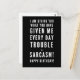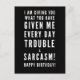 Desejo sarcástico de feliz aniversário para um amigo - "Estou dando a você o que você me deu todos os dias, problemas e sarcasmo! Feliz aniversário!" Perfeito para seus amigos que falam sarcasmo fluentemente! Sentimento de tipografia preto e branco clássico e direto. Gostou do meu estilo? Confira outros designs e ilustrações na minha loja :)