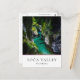 Cartão postal da Garganta de Tolmin com penhascos íngremes cobertos de musgo e água azul magnífica no Vale de Soca, perto de Kobarid na Eslovênia com uma caixa branca com o texto 'Vale de Soča, Eslovênia' e linhas em branco, azul e vermelho, as cores da bandeira eslovena.