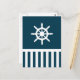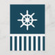 Design náutico com roda de vela e decoração de listras azuis e brancas sobre fundo azul