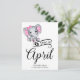Elefante de menina adorável com orelhas de bolinhas rosa e arco minúsculo acima do ouvido, tipografia "Devido em abril" e modelo para mensagem especial anunciando gravidez.