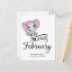 Elefante de menina adorável com orelhas de bolinhas rosa e arco rosa minúsculo ao longo do ouvido, tipografia "Devido em fevereiro" e modelo para mensagem especial anunciando gravidez.