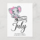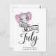 Elefante de menina adorável com orelhas de bolinhas rosa e arco rosa minúsculo acima do ouvido, tipografia "Devido em julho" e modelo para mensagem especial anunciando gravidez.