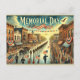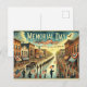 Aqui está um cartão-postal de viagem em estilo aquarela vintage para o Memorial Day (EUA), apresentando um desfile patriótico em uma pequena cidade americana com prédios de tijolos decorados com bandeiras e flâmulas, veteranos marchando orgulhosamente e crianças acenando bandeiras. 🇺🇸✨ O design tem cores suaves e desbotadas e tipografia vintage nostálgica, criando uma aparência calorosa e encantadora.