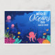 Celebre o Dia Mundial dos Oceanos com este vibrante e divertido cartão postal temático submarino, apresentando criaturas marinhas coloridas como polvo, águas-água, recifes de coral e peixes tropicais. A cena do oceano azul profundo captura a beleza e a diversidade da vida marinha, tornando-o perfeito para campanhas de conscientização ambiental, atividades em sala de aula ou envios ecológicos.