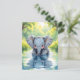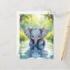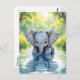 Uma maneira adorável de dizer oi, sinto sua falta e mantenho contato com um amigo ou familiar. A frente deste cartão postal bonito tem uma bela ilustração de um bebendo de elefante bebê fora de um lago enquanto olha para seu próprio reflexo.