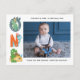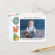 Cartões de agradecimentos de primeiro aniversário moderno, colorido e elegante. Design com o script Dino um, obrigado sua mensagem e uma foto. Perfeito como um obrigado que você fez para o Dinossauro temeu a primeira festa de aniversário.