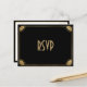 A frente deste cartão postal de casamento floral, elegante e divertido, da arte deco, apresenta a tipografia vintage sans serif em texto dourado sobre fundo preto, cercado por uma única e mínima fronteira de folha de ouro falso com flores retrorreflectoras nos cantos, combinando glamour sofisticado com minimalismo. A parte traseira apresenta um fundo preto com uma área branca dourada no centro com uma data de resposta personalizável, e vazios que os convidados devem preencher, incluindo três opções de refeição, bem como o seu endereço de devolução. Você pode personalizar o texto editando o modelo do produto para personalizar este cartão para seu próprio casamento.