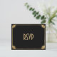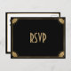 A frente deste cartão postal de casamento floral, elegante e divertido, da arte deco, apresenta a tipografia vintage sans serif em texto dourado sobre fundo preto, cercado por uma única e mínima fronteira de folha de ouro falso com flores retrorreflectoras nos cantos, combinando glamour sofisticado com minimalismo. A parte traseira apresenta um fundo preto com uma área branca dourada no centro com uma data de resposta personalizável, e vazios que os convidados devem preencher, incluindo três opções de refeição, bem como o seu endereço de devolução. Você pode personalizar o texto editando o modelo do produto para personalizar este cartão para seu próprio casamento.