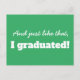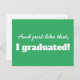 Um design de tipografia minimalista engraçado em verde e branco com uma combinação de texto legal que diz: E assim, eu me formei! com um modelo de texto na parte de trás para você adicionar seu texto personalizado em cores verde e branco invertidas. #agradecimento