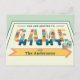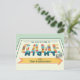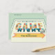 Cartão postal de convite à noite de jogos com uma tipografia divertida de "Game Night''. Esses designs incluem elementos de azul, amarelo, vermelho e laranja, um fundo de conselho de jogos, dados, peças de jogos, cartões de jogos e elementos inspirados nos jogos de conselho. Os produtos incluem um modelo para personalização pessoal.