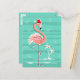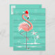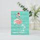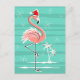 Na moda com um toque retrorreflector com um flamingo rosa festivo vestindo um chapéu vermelho de Santa, estrelas e palmeiras decoradas com bolhas colocadas sobre um fundo de aqua listrado. Um design personalizável para você personalizar com seu próprio texto, imagens e ideias. Uma imagem de arte digital original criada por Quirky Chic.