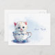 Lindo cartão postal do gatinho na xícara com flores azuis