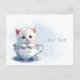 Lindo cartão postal do gatinho no copo com flores azuis