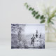 Uma fotografia que mostra apenas um vislumbre do lago da montanha através de abetos cobertos de neve. Esta imagem de paisagem é manipulada digitalmente para parecer uma aquarela.