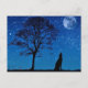 Um desenho de uma silhueta de lobo preto uivando para a lua com uma árvore ao fundo.
