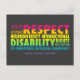 Imagem é um grupo de palavras em letras maiúsculas listradas: aceitação autista, respeito, neurodiversidade, interseção, direitos de deficiência, presunção de competência, inclusão, comunidade. O fundo é preto.