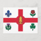 Cartão postal com a bandeira de Montreal, a cidade mais populosa da província de Quebec, Canadá. Uma bandeira branca com uma cruz vermelha, um pinho branco, uma Fleur-de-lys azul, uma rosa vermelha de Lancaster, uma shamrock, e um caroço