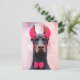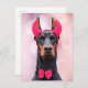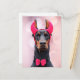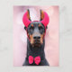 O Doberman Pinscher, cão de raça negra e castanha, vestindo chifres-do-diabo cor-de-rosa brilhante numa faixa de cabeça cor-de-rosa e uma gravata de bolso rosa. Colocado sobre um fundo de flare de boque rosa.