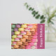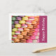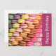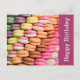Uma torre de macarões coloridos mostrada de forma artística em uma janela de padaria. A frente diz Feliz Aniversário contra um bonito fundo rosa. As costas dizem que Hope seu aniversário é tão doce que te deixa tonto. Você pode personalizá-lo com suas próprias palavras, se desejar. Esta é uma carta divertida para dar a alguém que tem amor por esta confeitaria merengue.
