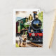 A nostalgic scene of a dog greeting the arrival of a green steam train.