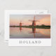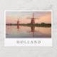 Cartaz fotográfico de duas moinhos de vento ao longo de um rio com reflexo na água tranquila à luz do sol numa noite de verão nos Países Baixos com uma borda branca e o texto "Holanda" e listras em vermelho, branco e azul, as cores da bandeira holandesa.