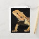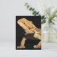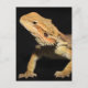 Um curioso dragão barbudo olhando para frente em frente a um fundo preto.