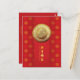 Papel do Dragão ouro cortado num círculo de ouro com "Ano do Dragão" + "Feliz Ano Novo Chinês" em Inglês e Chinês (caligrafia) sobre um fundo decorado de padrão vermelho. Design no cartão postal vertical. Perfeito para o Ano Novo Chinês do Dragão 2024.