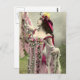 Uma fotografia colorida vintage de uma jovem mulher de cabelos escuros em um vestido coberto de flores fazendo uma pose dramática. Flores também cobrem seus cabelos. As cores são rosa claro e rosa profundo com um toque de amarelo.