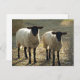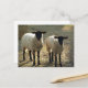 Um par de ovelhas Suffolk jovens, duas ovelhas de rosto negro num pasto ou quintal, com luz solar à tarde criando uma cena pastoral. Os suffolks são originários da Inglaterra e são a ovelha mais popular nos Estados Unidos, que compreende cerca de 60% da população de ovelhas domésticas. Este cartão-postal é perfeito para quem guarda ou admira ovelhas, em especial para os Suffolks, incluindo os agricultores comerciais, os criadores de passatempo e os pastores, todos aqueles que exibem ovelhas. Os ovinos são, em geral, de natureza suave e a raça Suffolk é bastante dura. Como guias de espírito animal ou totens, as ovelhas representam bondade e compaixão, honestidade e confiança, talentos artísticos, comunidade, profundidade emocional e harmonia doméstica. A ovelha é o oitavo sinal do zodíaco chinês e o ano da ovelha (ou cabra) cai a cada doze anos, incluindo 1955, 1967, 1979, 1991, 2003, 2015 e 2027. Foto: Jacquie Wingate.