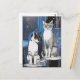 Cartão-postal, ilustrado por dois gatos, sentam-se graciosamente contra um fundo azul profundo, abstrato. As texturas realistas de pelo com ousada linhagem e elementos geométricos criam uma atmosfera moderna e surreal. Seus olhos amarelos expressivos contrastam impressionantemente com os arredores legal.