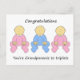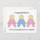 Duas filhas de desenho animado e um menino vestindo ternos cor-de-rosa e azuis e as palavras 'Parabéns, vocês são avós para triplicar!'