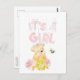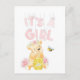 Chá de fraldas de design "É uma garota" com um ursinho de pelúcia bonito com flores cor-de-rosa e um barril de mel assistindo uma abelha de mel fofinha. A divertida timento tipografia rosada é pendurada em cima com cordas bonitinhas e pendurada para baixo. Flores e modelos cor-de-rosa para criar o seu próprio convite de volta.