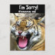 Um tigre com a boca aberta, dentes mostrando, excelente por: Desculpe, perdoe-me, ei! e muito mais.