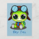 Uma bela ilustração de desenho animado. Uma tartaruga verde vestindo um cachecol azul e um chapéu de aviador marrom com goggle. Grandes olhos kawaii e um sorriso adorável. Escreveste uma fonte azul e esquisita.